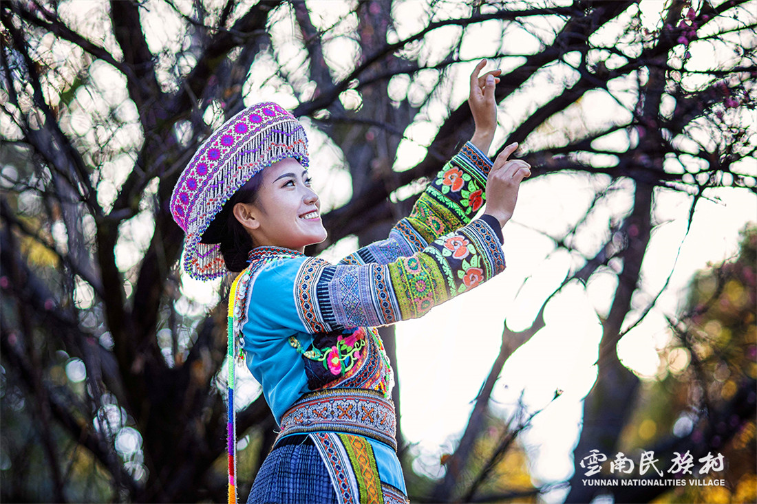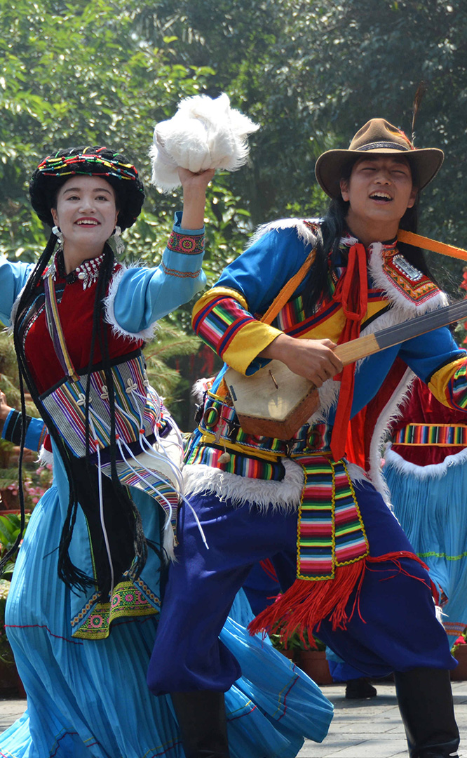彝族在云南境內(nèi)約471萬人,是省內(nèi)人口最多、分布最廣的少數(shù)民族,主要聚居在金沙江、元江流域和哀牢山、無量山腹地。彝族是一個(gè)能歌善舞的民族,民間打歌、跳樂之風(fēng)盛行,大三弦、跌腳舞久負(fù)盛名。火把節(jié)是彝族最具特色的民族節(jié)日。彝族村占地50余畝,三虎浮雕墻與虎頭內(nèi)祖師形象表現(xiàn)了彝族虎鷹文化。太陽歷廣場圖騰柱上有太陽、虎、火和八卦圖形象,周圍環(huán)繞著10個(gè)朝向不同的月球造型,外圓周有12生肖石雕。依山而建的“...
